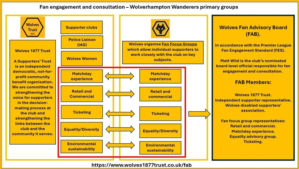 Existing supporters’ clubs are set up to serve their own members in respect of providing relevant information and dealing with specific matters, such as organising match travel coaches and local events. Supporters’ groups also arrange Q&A Fans Forum sessions with past and present people involved with Wolves. The trust will encourage open dialogue with all supporters’ groups, but our roles are distinctly different. Supporters’ groups can be represented within the trust, although it is recognised that there are now many informal supporters’ groups emerging, Facebook, Chat Sites, YouTube channels etc